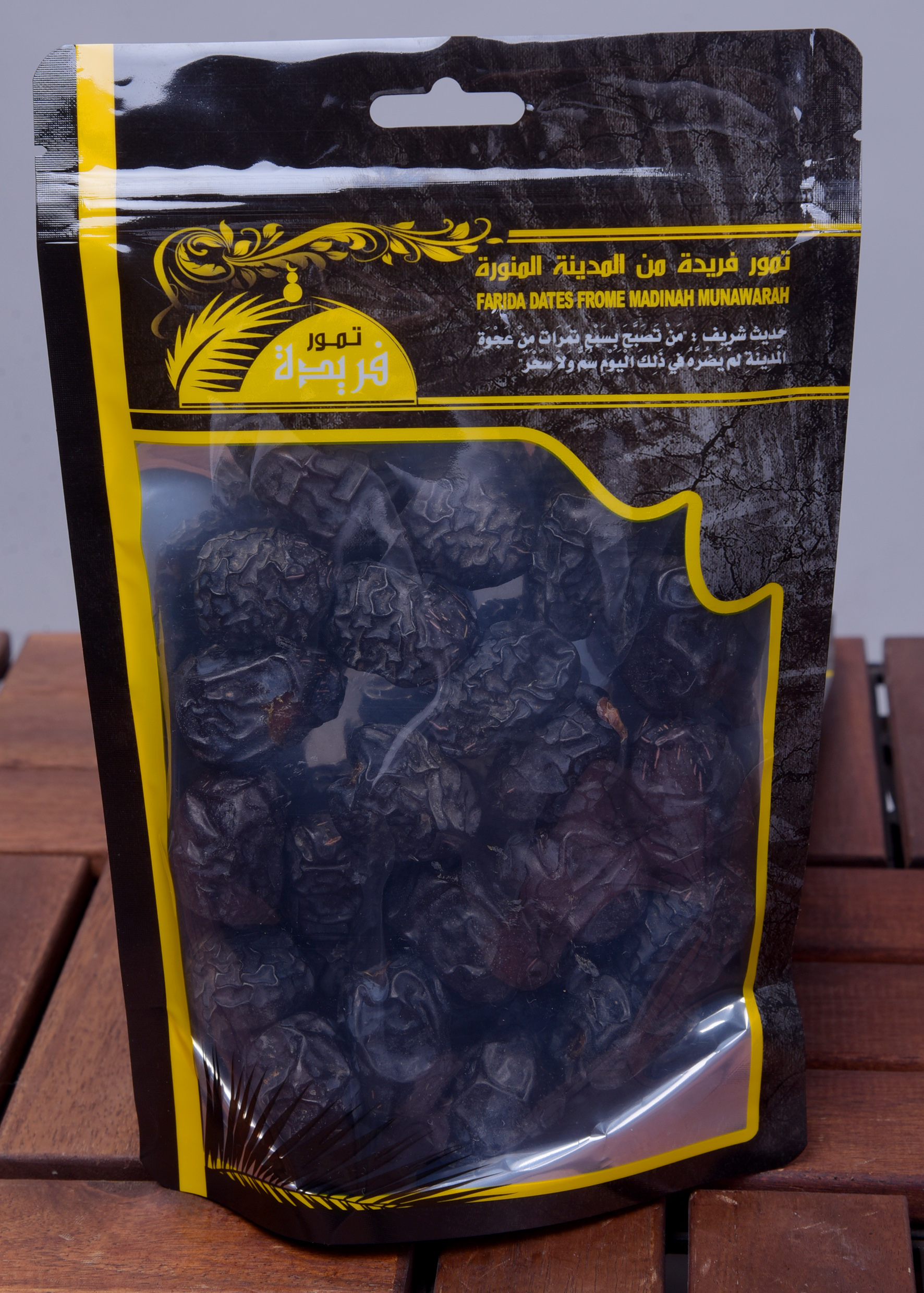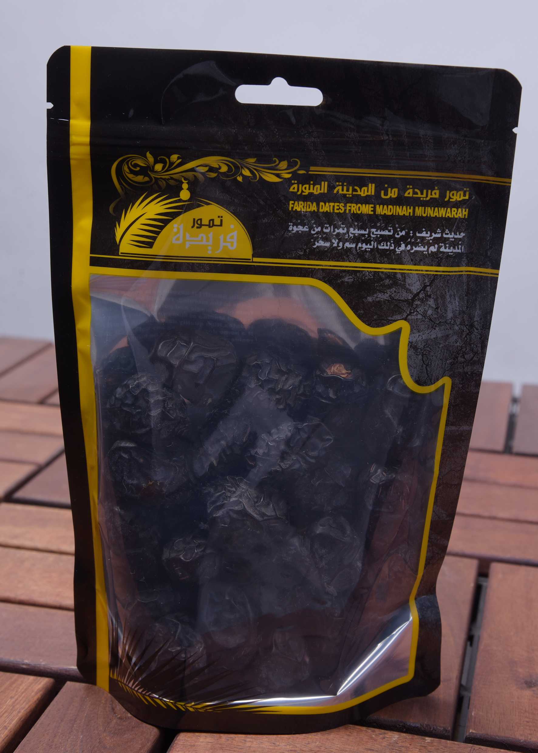 250 جرام من تمر العجوة معبأة بمغلفات شفافة أنيقة تظهر ملامج التمور ونضارتها وبسعر جيد في متناول الجميع